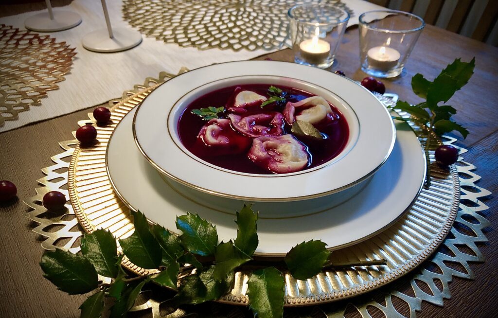 Rozpoczynamy przygodę z barszczem ok tydzień przed świętami. Obieramy buraki, kroimy na klocki i wkładamy do słoja, w którym ląduje też czosnek. Wszystko zalewamy wodą z solą (na 1 litr wody, 2 łyżeczki soli niejodowanej). Używam zwykłej wody z kranu, nie gotuję jej. Szczelnie zakręcam słój i odstawiam w ciepłe, nienasłonecznione miejsce. Po ok 5 dniach barszcz jest gotowy. Odcedzam i gotuję na wolnym ogniu z liśćmi laurowymi, angielskim zielem i pieprzem.