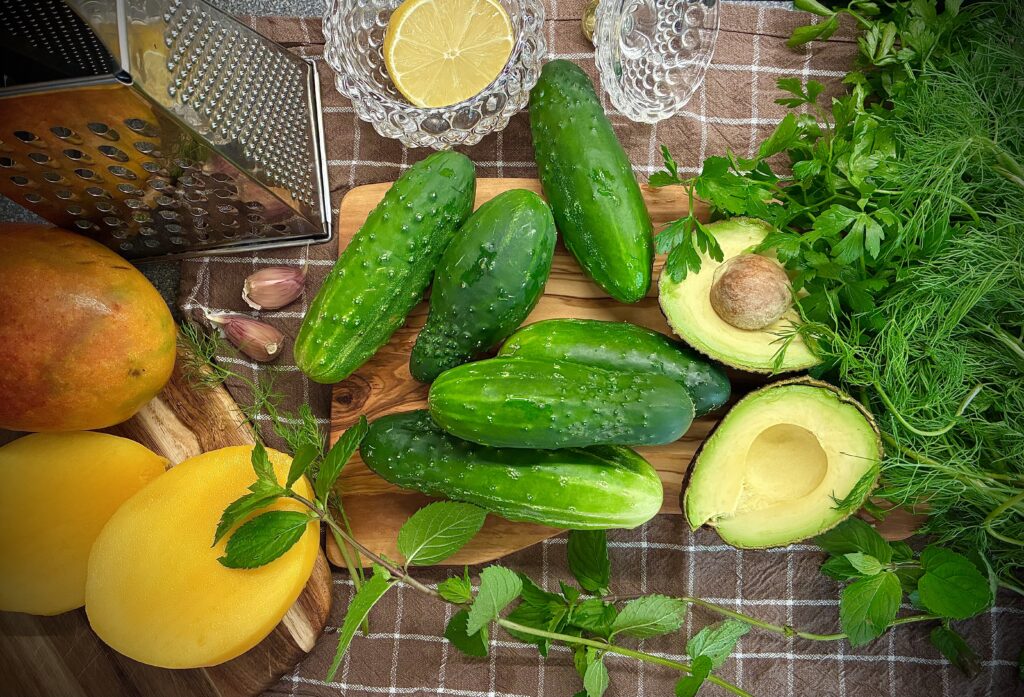 Ogórki obieramy ze skórki i szatkujemy. 3/4 mango kroimy w drobną kostkę, a resztę mango ścieramy na drobnej tarce na pulpę. Pół awokado rozgniatamy widelcem na gładką masę, resztę kroimy w drobną kostkę. Zostawiamy trochę pokrojonego mango i awokado do dekoracji. Szatkujemy koperek, natkę pietruszki. Rozgniatamy czosnek. Wszystkie składniki dodajemy do jogurtu. Następnie doprawiamy do smaku sokiem z cytryny, solą i pieprzem. Odstawiamy na godzinę do lodówki do przegryzienia smaków.