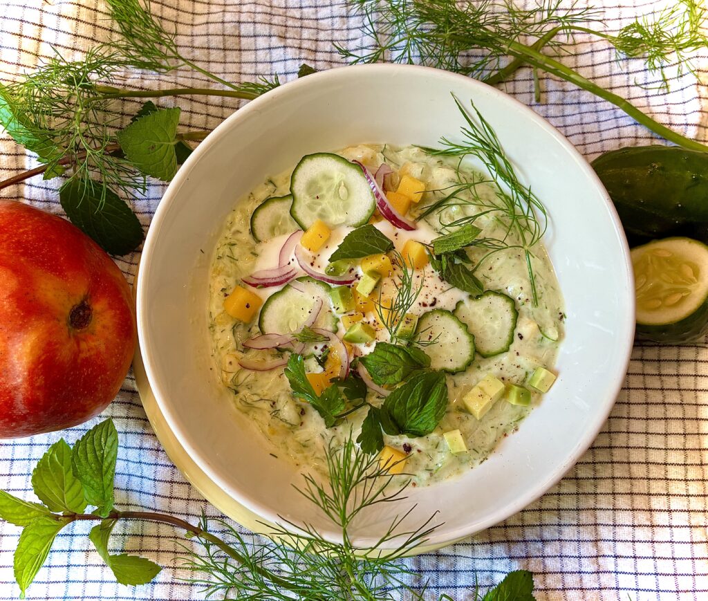 Podajemy udekorowane plasterkami ogórka kosteczką mango i awokado, piórkami czerwonej cebuli, gałązkami koperku i listkami mięty, która wspaniale podbije świeżość potrawy.