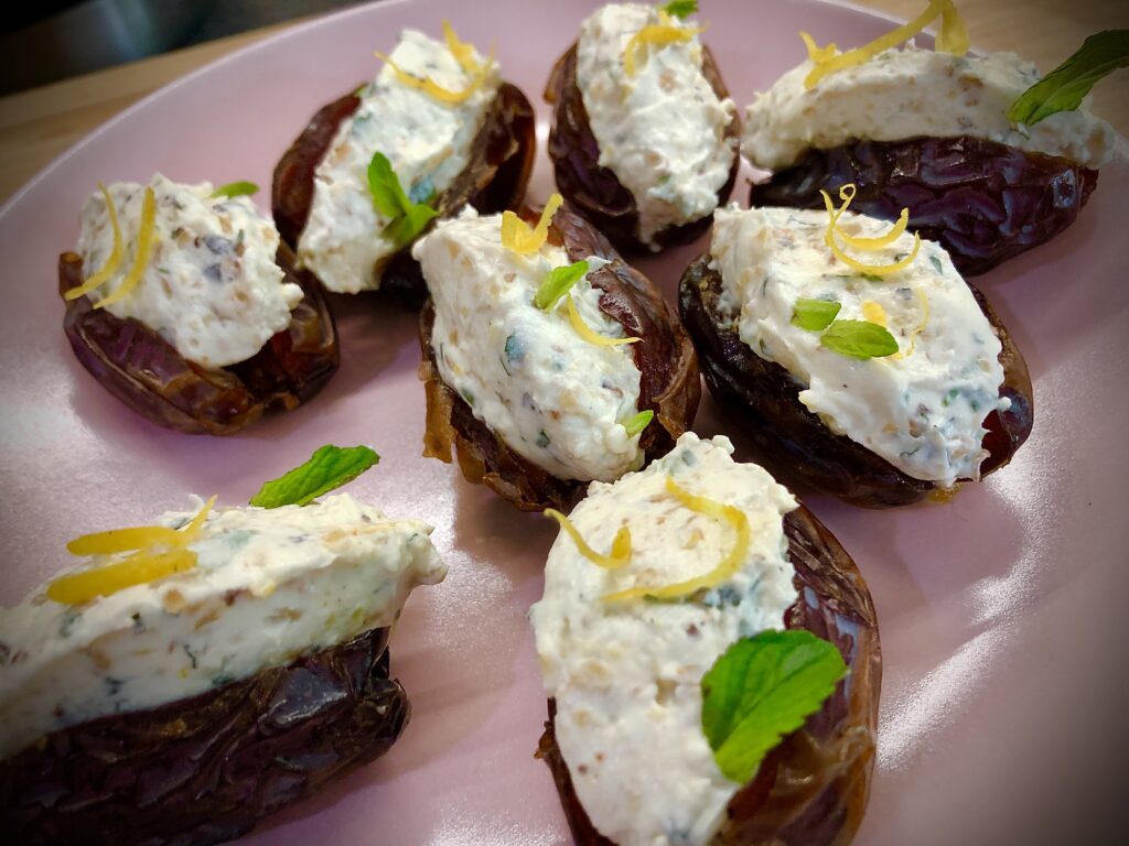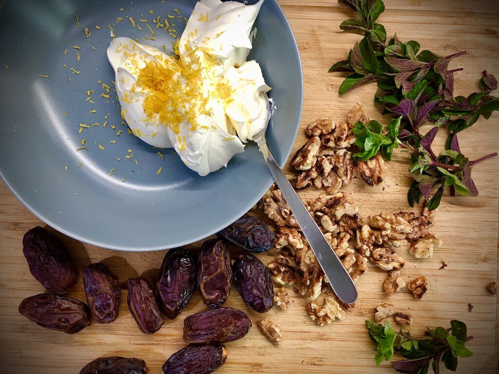 Daktyle nacinamy, tak, by nie przeciąć całkowicie i wyciągamy pestkę. Prażymy orzechy i szatkujemy drobno. Również mięte szatkujemy. Łączymy serek mascarpone, orzechy, miętę. Dodajemy otartą skórkę z cytryny i sok do smaku, mieszamy. Faszerujemy daktyle. Ozdabiamy wiórkami cytrynowymi oraz listkami mięty.