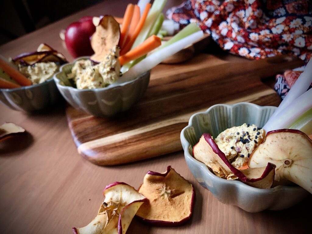 Jabłko pokroić w plastry i wysuszyć w maszynie. Rzodkiew, marchewkę i seler naciowy pokroić w słupki. Kawałki jabłka i warzyw będą idealne do nabierania serka.