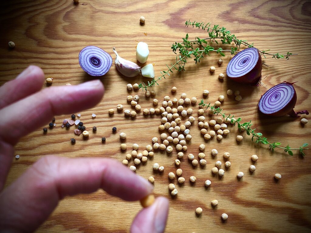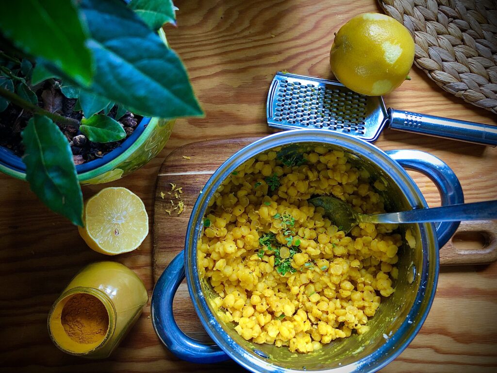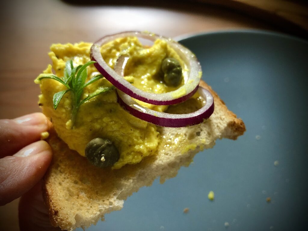 Groch gotuję do miękkości, wodę z gotowania odlewam do osobnego naczynia, jeszcze się przyda. Dodaje kurkumę, oliwę, starty czosnek, tymianek i sok z połowy cytryny. Dodatkowo ścieram skórkę cytrynową. Doprawiam solą i pieprzem. Wszystko blenduję na gładką masę, konieczne będzie wykorzystanie wody z gotowania grochu. Trzeba ją dodawać partiami, żeby nasza fava nie była za rzadka. Wykładam na talerz. Dekoruje cebulą, kaparami i skrapiam oliwą. Serwuje się ze świeżym pieczywem, u mnie tosty.