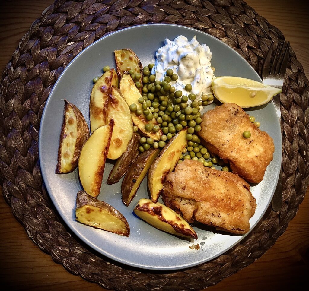 Rybę płuczemy i suszymy ręcznikiem papierowym. Opruszamy solą i pieprzem. Ze wszystkich składników na ciasto przygotowujemy masą, która przypomina gęstą śmietanę. Używamy mąki, proszku do pieczenie, jajka, octu, gumy ksantanowej (tylko w przypadku mąki bezglutenowej). Konieczne będzie dodanie wody z umiarem, by nie rozrzedzić nadto ciasta. Otaczamy kawałki ryby w cieście i od razu wrzucamy na głęboki, bardzo gorący olej. Rumieni się z obu stron. Następnie wyciągamy na papierowy ręcznik w celu odsączenia nadmiaru oleju. Wcześniej przygotowujemy ziemniaki. Ja szoruję je pod bieżącą wodą i zwykle nie obieram ze skórki (jeśli jest ładna skórka). Kroję na łódeczki i polewam oliwą, przyprawiam solą oraz sporą ilością tymianku. Piekę w piekarniku do mocnego zrumienienia ok 40 minut. W międzyczasie przygotowuje sos majonezowy. Majonez rozrzedzam jogurtem naturalnym i dodaję posiekane kapary, oliwki, natkę pietruszki, szczypior. Przyprawiam solą, pieprzem. Na talerzu układam rybę, ziemniaki, groszek konserwowy, sporą ilość sosu i doprawiam jeszcze świeżo zmielonym pieprzem. Wspaniałe smaki.