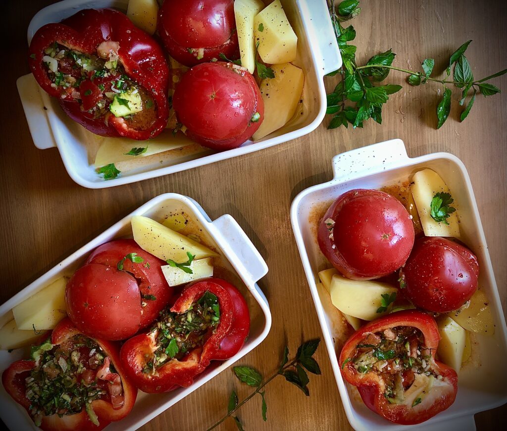 Papryki przecinamy na pół i wdrążamy gniazda nasienne. Z sześciu pomidorów odcinamy górę i wydrążamy wnętrze (nie wyrzucamy, przyda się). W misce łączymy suchy ryż, rozdrobniony miąższ z wydrążonych pomidorów, dodatkowo dwa pokrojone na bardzo drobną kostkę pomidory, drobno posiekaną cukinię, cebulę i czosnek, poszatkowaną mięte i natkę z pietruszki oraz oregano i sól i pieprz. Mieszamy do równego połączenia. Farsz ma być bardzo wodnisty, tak, by ryż „ugotował się” podczas pieczenia. Farszem wypełniamy połówki papryk i wydrążone pomidory. Każdego nafaszerowanego pomidora i paprykę skrapiamy oliwą (ilość dowolna, wedle gustu). Układamy w naczyniu żaroodpornym. Dodatkowo uzupełniamy potrawę ćwiartkami ziemniaków. Wszystko wsadzamy do piekarnika i pieczemy ok 45 minut w temperaturze 190°C. Można z góry przykryć folią aluminiową, jeśli się zbyt mocno rumieni.