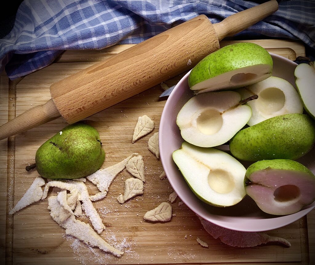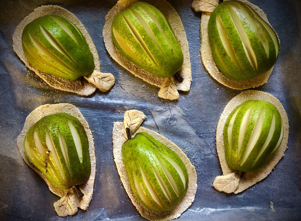 Gruszki przepoławiamy i wydrążamy gniazda nasienne, na grzbiecie nacinamy je fantazyjnie. Wszystkie składniki ciasta łączymy ze sobą, ciasto ma być twarde, żeby łatwo formowało się z niego placuszki. Wałkujemy i wycinamy kształt gruszki , ręcznie lepimy listek, który będzie ozdobą. Na ciasto wysypujemy cieniutką warstwę cukru i kładziemy połówkę gruszki, dolepiamy listek z ciasta. Brzegi smarujemy jajkiem. Wsadzamy do piekarnika na 180 °C na ok. 20-25 minut. Trzeba obserwować, jak się rumieni. Po wyciągnięciu z piekarnika lekko opuszamy do dekoracji cukrem pudrem. Jeśli chcemy ograniczyć ilość węglowodanów możemy użyć tyko mąki migdałowej i kokosowej oraz minimalną ilość cukru. Pyszne i cudne :), smacznego!