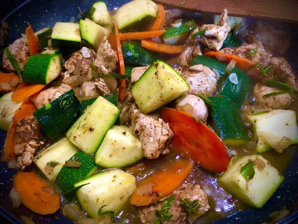 Wszystkie składniki garam masala wkładamy do rozdrabniacza i na bardzo wysokich obrotach zamieniamy na pył. Dotyczy to: pieprzu, kolendry, kardamonu, kminu, goździków, cynamonu, liści laurowych i gałki muszkatołowej. Indyka kroimy w klocki i lekko podsmażamy wraz z cebulą i czosnkiem. Następnie dodajemy pokrojoną w klocki cukinie i marchew i przyprawiamy sporą ilością przygotowanej własnoręcznie garam masala, można użyć gotowej przyprawy. Lekko podduszamy, żeby soki puściły i smaki się przegryzły. Na dno żaroodpornego naczynia dajemy troszkę oliwy i wsypujemy suchy ryż. Następnie wykładamy warzywa z mięsem i na środek układamy całego pomidora. Być może trzeba będzie wlać trochę wody, żeby danie było dość wilgotne, by ryż mógł się ugotować podczas zapiekania. Dekorujemy świeżymi ziołami i pieczemy ok 40 minut w temperaturze 180°C.