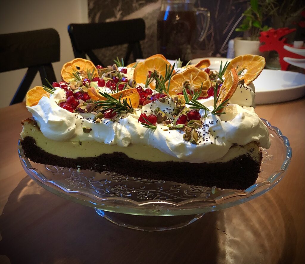 Kostkę masła, połowę cukru, 3 łyżki kakao i cukier waniliowy oraz 1/3 szklanki wody gotować do połączenia składników. Z 4 jaj oddzielić żółtka od białek. Z białek ubić pianę. Do masy kakaowej po wystudzeniu dodać żółtka, mąkę i proszek do pieczenia i połączyć. Następnie dodać pianę z białek i delikatnie wymieszać. W międzyczasie połączyć na gładką masę, najlepiej w robocie kuchennym, ser z resztą cukru, połową kostki masła oraz 4 jajkami. Na blachę posmarowaną masłem i posypaną bułką tartą wyłożyć ciemną masę , a następnie równo rozprowadzić masę serową. Piec przez 1 godzinę w piekarniku rozgrzanym do temperatury 200 °C. Po wystudzeniu udekorować ubitą na sztywno śmietaną, owocami, makiem i orzechami.
