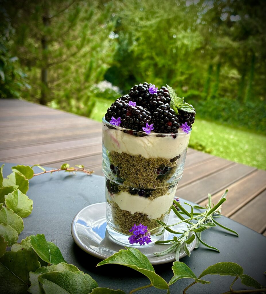 Do blendera wsypujemy orzechy, cukier trzcinowy i same listki mięty. Mielimy na żwirek. Do serka mascarpone wsypujemy cukier waniliowy i miksujemy, żeby stał się puszysty. Układamy w szklaneczkach warstwowo, najpierw warstwa miętowych orzechów, serek mascarpone, kilka jeżyn, orzechy, znów serek mascarpone, na koniec jeżyny. Ozdabiamy listkami mięty i jadalnymi kwiatami (u mnie lawenda).