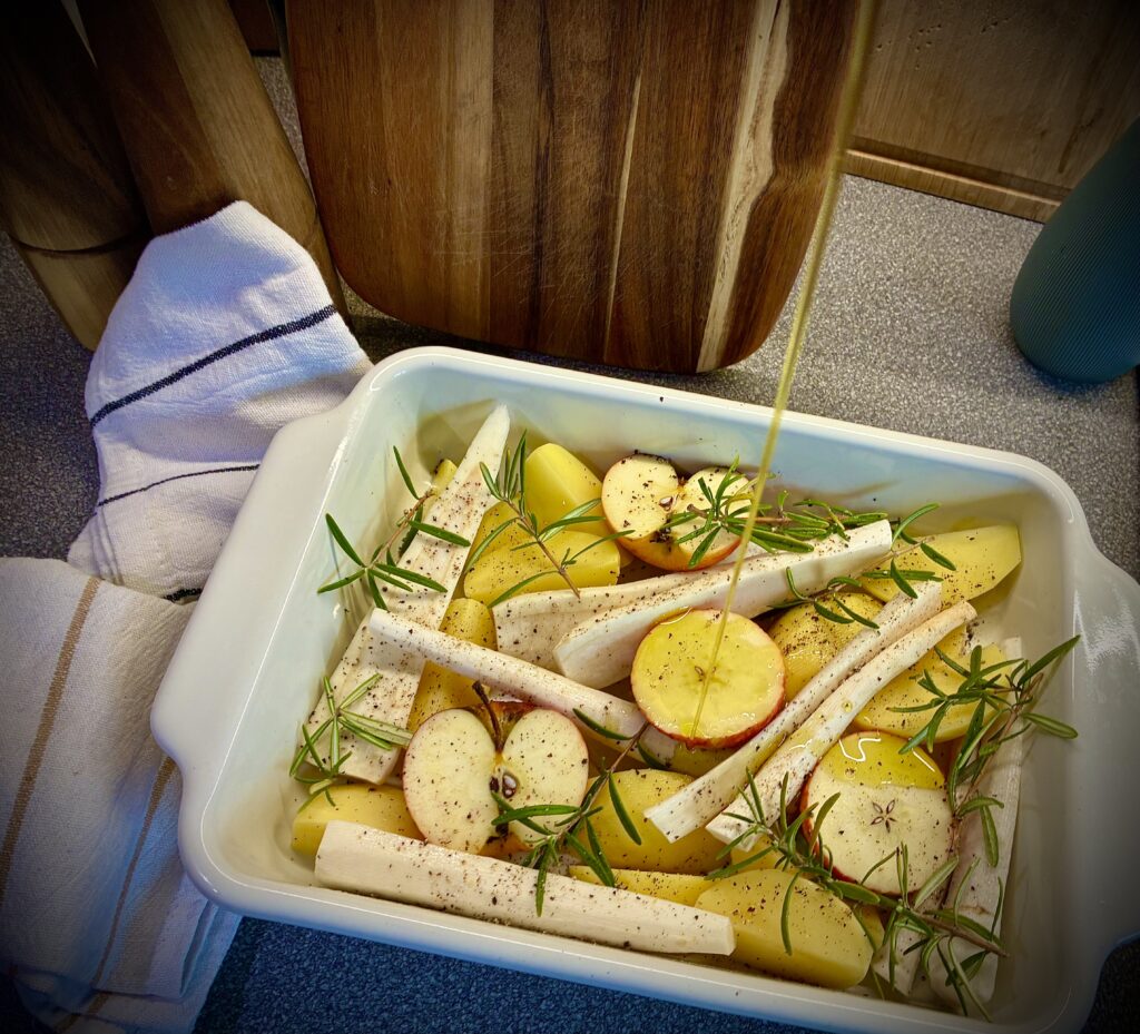 Pasternak i ziemniaki obieramy ze skórki. Jabłka przekrawamy na pół. Warzywa i jabłka układamy w naczyniu żaroodpornym, przyprawiamy rozmarynem, solą i pieprzem polewamy oliwą. Pieczemy do miękkości i lekkiego zrumienienia. Buraki myjemy i gotujemy w całości ze skórką. Można też upiec lub kupić już gotowane. Po wystudzeniu obieramy i ścieramy na grubych lub drobnych oczkach. Doprawiamy solą, pieprzem, octem jabłkowym lub cytryną oraz chrzanem. Kaczkę wyciągamy z lodówki ok pół godziny przed przygotowaniem. Myjemy i porządnie osuszamy ręcznikiem papierowym, Skórę nacinamy w kratkę i solimy. Układamy od strony skóry na zimną patelnię i zaczynamy smażenie. Jak skórka mocno się przyrumieni, odwracamy na drugą stronę. Mięso przekładamy do piekarnika rozgrzanego do temperatury 200°C, polewamy wytworzonym podczas smażenia tłuszczem, przykrywamy folią aluminiową i pieczemy jeszcze ok 15 minut. Następnie kroimy w plastry wraz ze skórką. Podajemy z upieczonymi warzywami, burakami oraz jabłkiem. Posypujemy świeżo mielonym czarnym pieprzem.