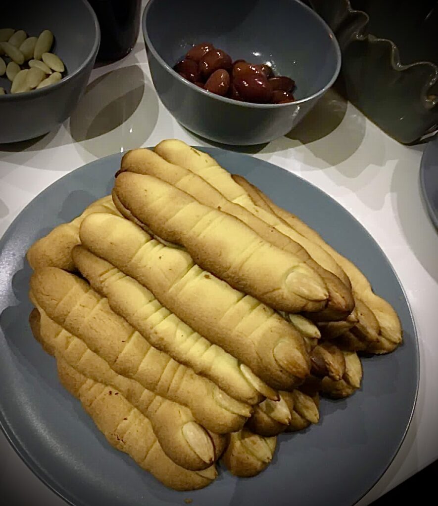 Najprostsze ciastka na świecie. Wszystkie składniki na ciasto wyrabiamy i owijamy w folię, wstawiamy na dłuższą chwilę do schłodzenia. W tym czasie migdały zalewamy wrzątkiem i zostawiamy na parę minut, żeby namoczyły się, to pozwoli na błyskawiczne usunięcie brązowej skórki, łatwizna. Schłodzone ciasto formujemy w wałeczki o długości ok 10-12 cm i średnicy ok 2 cm, wałeczki mogą być koślawe, garbate, w końcu wiedźma ma przecież straszne paluchy :). Nożem, ale drugą stroną (nie ostrzem) nacinamy ciasto w miejscu „stawów”, tak by paluch przypominał ludzki. Robią wrażenie, są hitem na halloween’owym stole.