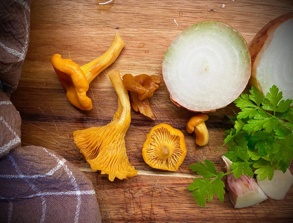 Grzyby musimy umyć, osuszyć. Następnie wrzucamy na rozgrzaną oliwę z dodatkiem masła, przyprawiamy solą pieprzem, dusimy. Dolewamy białe wino, być może trzeba będzie dodać trochę wody. Gdy płyn całkowicie odparuje, dodajemy igiełki rozmarynu (może być suszony) i jeszcze chwilę smażymy, żeby kurki się zrumieniły. Na drugiej patelni na oliwie podsmażamy drobno pokrojone w kosteczkę cebulę i czosnek. Dodajemy tymianek, mascarpone, kurkumę i sok z połowy cytryny, solimy i pieprzymy. Chwile musimy podgotować, żeby smaki się zintegrowały. Na półmisek wylewamy kremowy, gęsty sos, na który wykładamy grzyby i posypujemy zieleniną. Ja serwuję z chlebem, który przypiekam na patelni po smażeniu kurek.