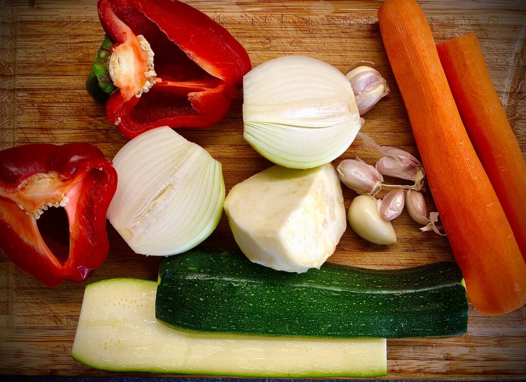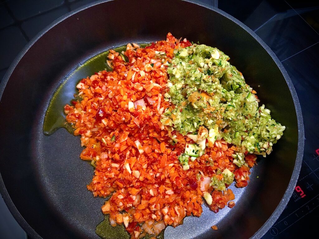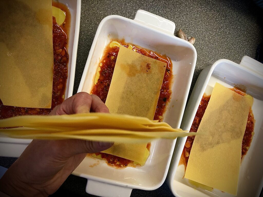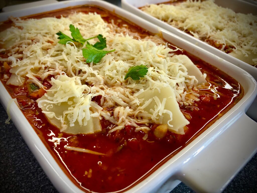 Wszystkie warzywa po kolei rozdrabniamy i podduszamy na oliwie. Doprawiamy ziołami i solą, pieprzem. Następnie dodajemy przecier pomidorowy, chwilę podgotowujemy. Sosu ma być dużo, ma być dość rzadki, ewentualnie można rozrzedzić wodą.  Następnie w naczyniu żaroodpornym układamy warstwami suchy makaron i sos i ser, rozpoczynając od sosu (na dno). Płaty makaronu muszą nurzać się w sosie, by zostały „ugotowane” podczas pieczenia. Ostatnią warstwę stanowi ser. Pieczemy w temp 180°C ok pół godziny. Ja widelcem sprawdzam, czy makaron jest mięciutki.
