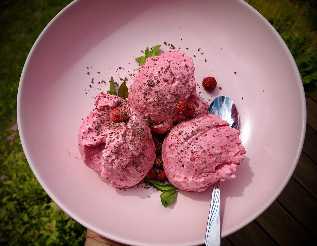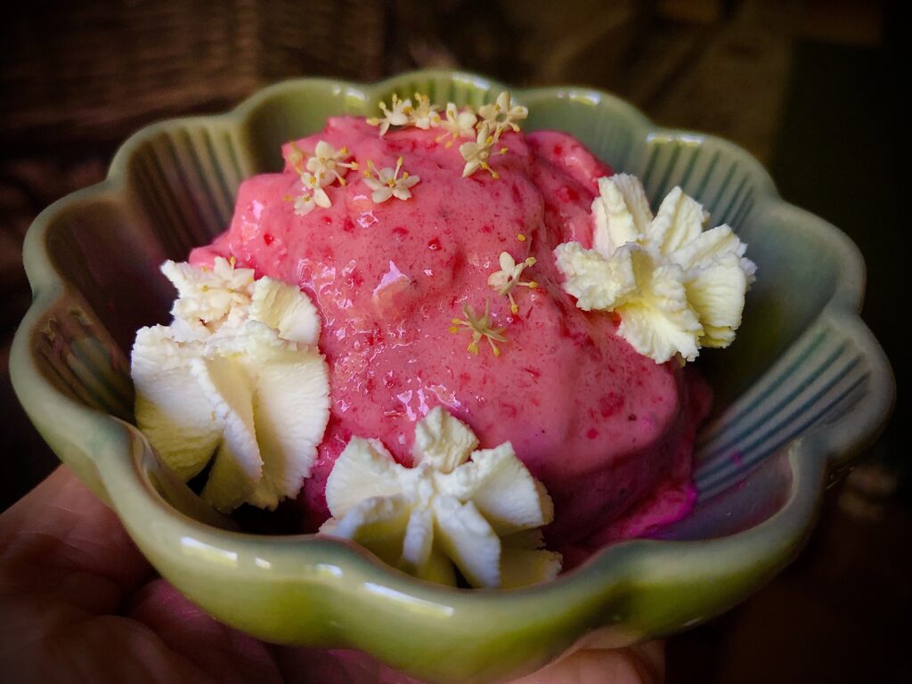 Wszystkie składniki wrzucamy do robota kuchennego zaczynając od mrożonych owoców. Następnie na bardzo wysokich obrotach miksujemy do uzyskania kremowej konsystencji. Ozdabiamy bitą śmietaną lub serkiem mascarpone i jadalnymi kwiatami, u mnie są to kwiaty dzikiego bzu.