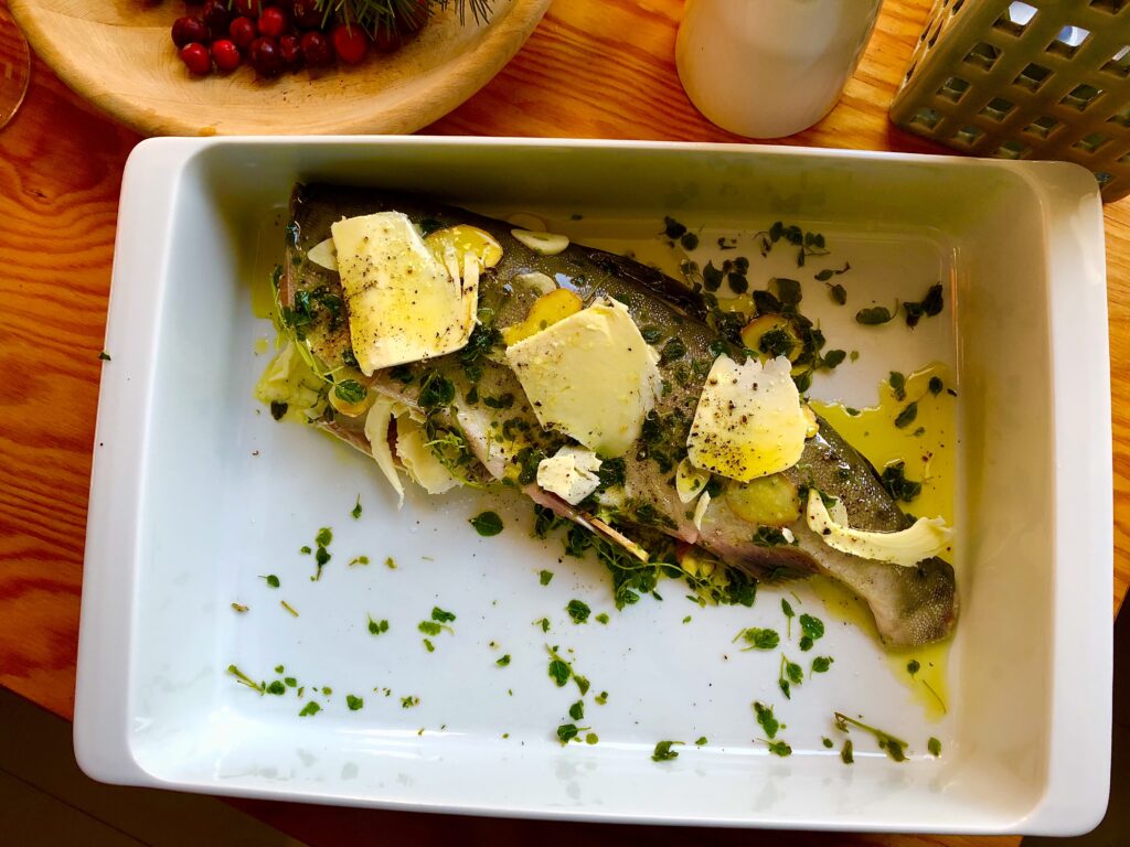 Rybę nacieram solą, pieprzem oraz tymiankiem i układam na warstwie oliwy w żaroodpornym naczyniu. Obkładam plasterkami świeżego imbiru, czosnkiem, gałązkami pietruszki. Całość polewam dodatkową porcją oliwy i układam na rybie kawałki masła. Wsadzam do pieca nagrzanego do temperatury 180°C na ok 20-30 minut. Trzeba obserwować proces pieczenia, najlepiej, żeby skórka się przyrumieniła.
