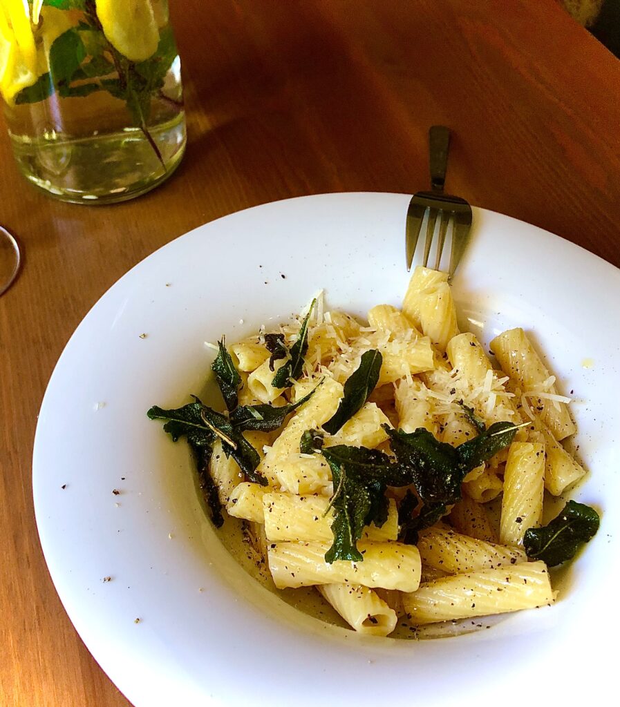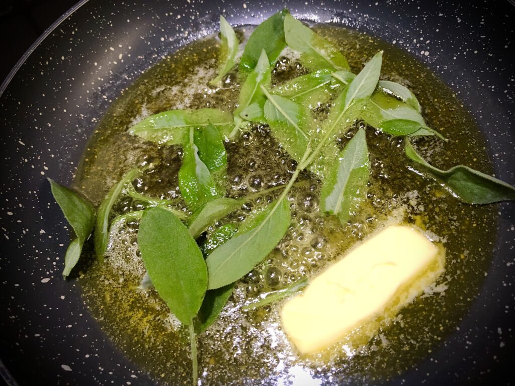 Szałwie myjemy i osuszamy. Na patelni rozgrzewamy sporą ilość oliwy i masła i wrzucamy pojedyncze listki szałwi. Na średnim ogniu mają smażyć się do chrupkości, ale nie spalić. Po wyłączeniu ognia pod patelnią do rozgrzanej oliwy dodajemy przetarty lub bardzo drobno posiekany czosnek.  Makaron gotujemy al dente. Skrapiamy oliwą i dodajemy utarty ser w ilości jaka nam odpowiada. Następnie wlewamy oliwę, na której smażyła się szałwia i mieszamy. Mamy wyczuwać wyraźny aromat szałwiowo-czosnkowo-serowy. Przekładamy na talerz i dekorujemy dodatkowo utartym serem, świeżo zmielonym pieprzem i sporą ilością szałwiowych chrupkich listków. Pycha!