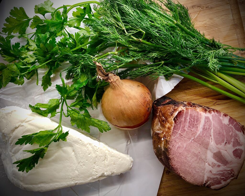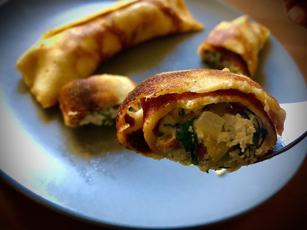 Z mleka, śmietanki, jaj i mąki przygotowujemy ciasto na naleśniki. Będzie dość płynne, bo to taka trochę oszukana wersja keto z małą ilością węglowodanów. Trzeba ostrożnie smażyć, bo są bardzo delikatne, ale bardzo lekkie. Możecie też zrobić klasyczne naleśniki. Baleron lub boczek kroimy w drobną kostkę i podsmażamy na smalcu. Do podsmażonej wędliny dodajemy pokrojoną w drobną kostkę cebule i jeszcze chwilę podsmażamy, żeby cebula się zeszkliła, ale nie zrumieniła. Farsz powstaje z połączenia sera, podsmażonej wędliny i cebuli, drobno posiekanego kopru i natki z pietruszki. Doprawiamy lekko solą i dużą ilością świeżo zmielonego pieprzu. Ma być pikantnie. Naleśniki wypełniamy farszem i podsmażamy na maśle do zrumienienia.