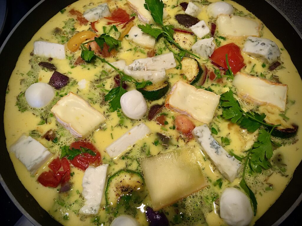 Na patelni przygotowuje warzywa, wszystkie podsmażam na oliwie do poziomu jaki najbardziej mi odpowiada. Łączę ze sobą 4 jajka, pół szklanki mleka, sól, pieprz i sporo świeżo startej gałki muszkatołowej. Na podduszone warzywa wlewam moją masę i układam na wierzchu dowolną ilość sera oraz posypuje zieleniną. Zmniejszam ogień pod patelnią i przykrywam szczelnie. Czekam, aż płynna masa zamieni się w nasz omlet, a ser rozpłynie się po powierzchni, naprawdę pycha.
