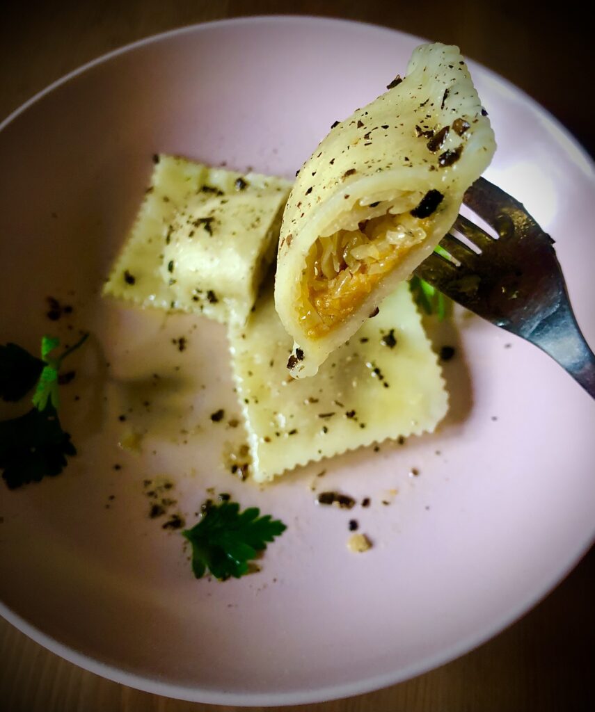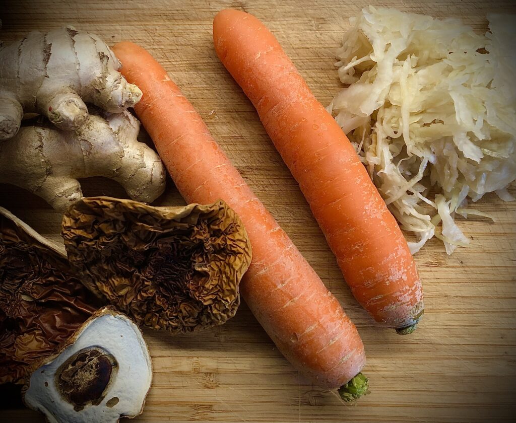 Mąkę wraz z olejem i bardzo ciepłą wodą łączymy ze sobą. Wyrabiamy ciasto. Kulkę ciasta można wsadzić do folii spożywczej, żeby stała się bardziej plastyczna. Na patelni rozgrzewamy oliwę i wrzucamy startą na drobnych oczkach marchewkę, starty imbir i czosnek. Doprawiamy solą pieprzem i chili. Podsmażamy, żeby odparować wodę i żeby farsz stał się gładki. Na drugiej patelni podsmażamy drobno posiekaną cebulę i dodajemy posiekaną kapustę kiszoną, przyprawiamy pieprzem. Ciasto wałkujemy i kroimy ma pasy. Nakładamy farsz kupkami, najpierw marchewka, następnie na marchewkę nakładamy kapustę. Przykrywamy drugim paskiem ciasta. Naokoło każdej „górki” dociskamy mocno, by dwa płaty ciasta się połączyły i radełkiem wykrawamy prostokąty lub kwadraty. Gotujemy w osolonej wodzie. Polewamy obficie roztopionym masłem i posypujemy rozdrobnionymi w blenderze suszonymi grzybami i pieprzem.