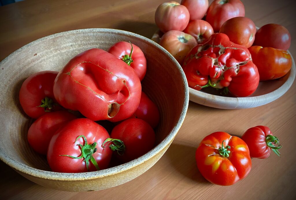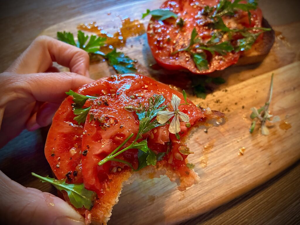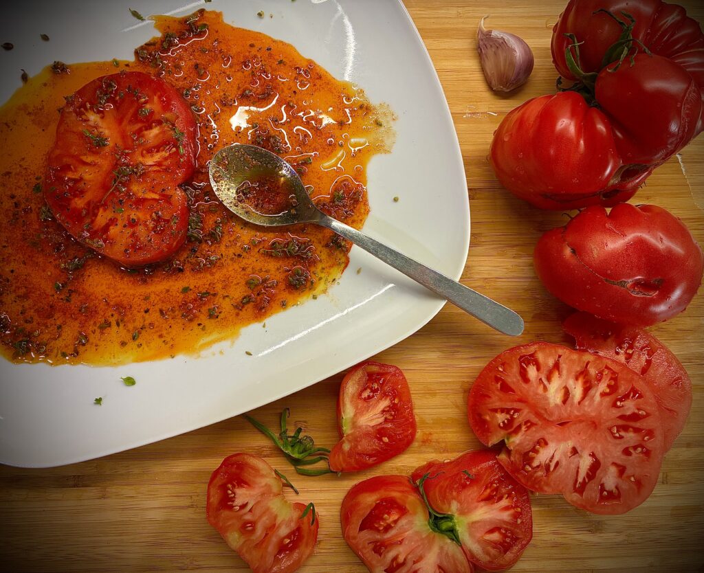 Lato jest wspaniałe, rodzi skarby, które nie potrzebują towarzystwa, same w sobie stanowią pyszną, pożywną i lekką przekąskę. Pomidory kroimy na grube plastry. Na talerz wylewamy sporą porcję oliwy, dodajemy paprykę, zioła i przetarty czosnek, sól oraz świeżo zmielony pieprz. Mieszamy do połączenia. Każdy plaster maczamy w aromatycznej oliwie i układamy na opieczonym, chrupiącym chlebie. Można udekorować natką pietruszki, kwiatami ziół.