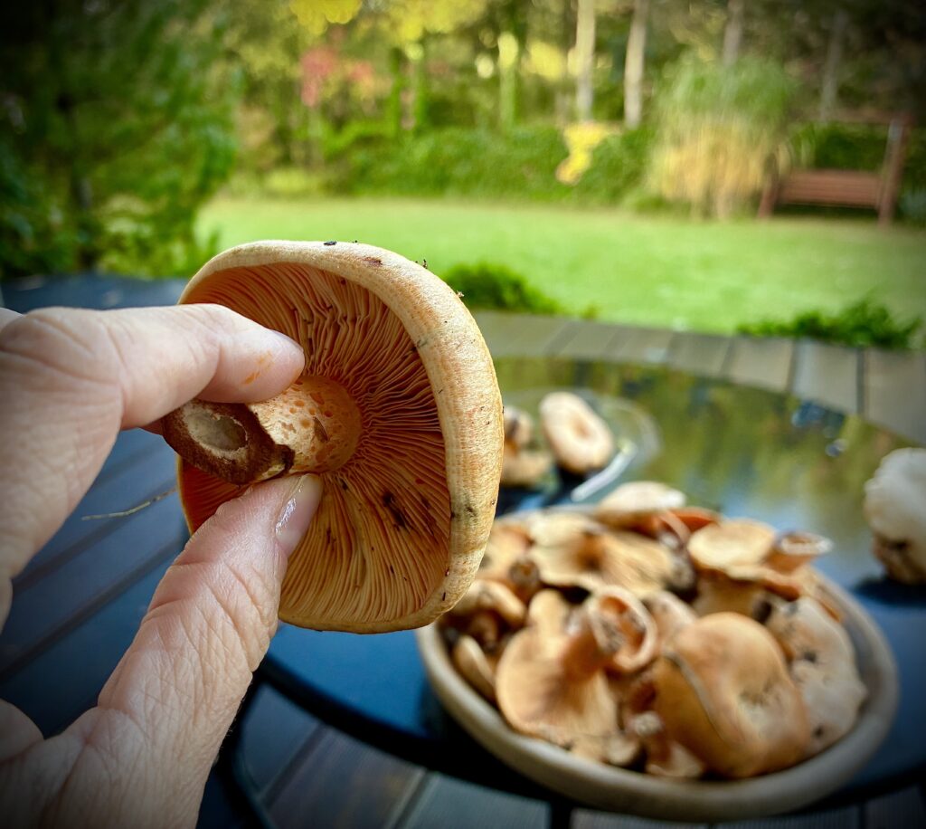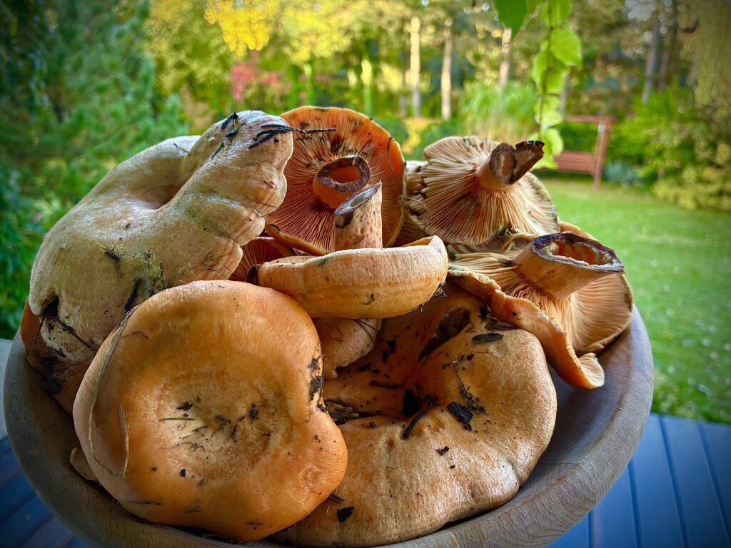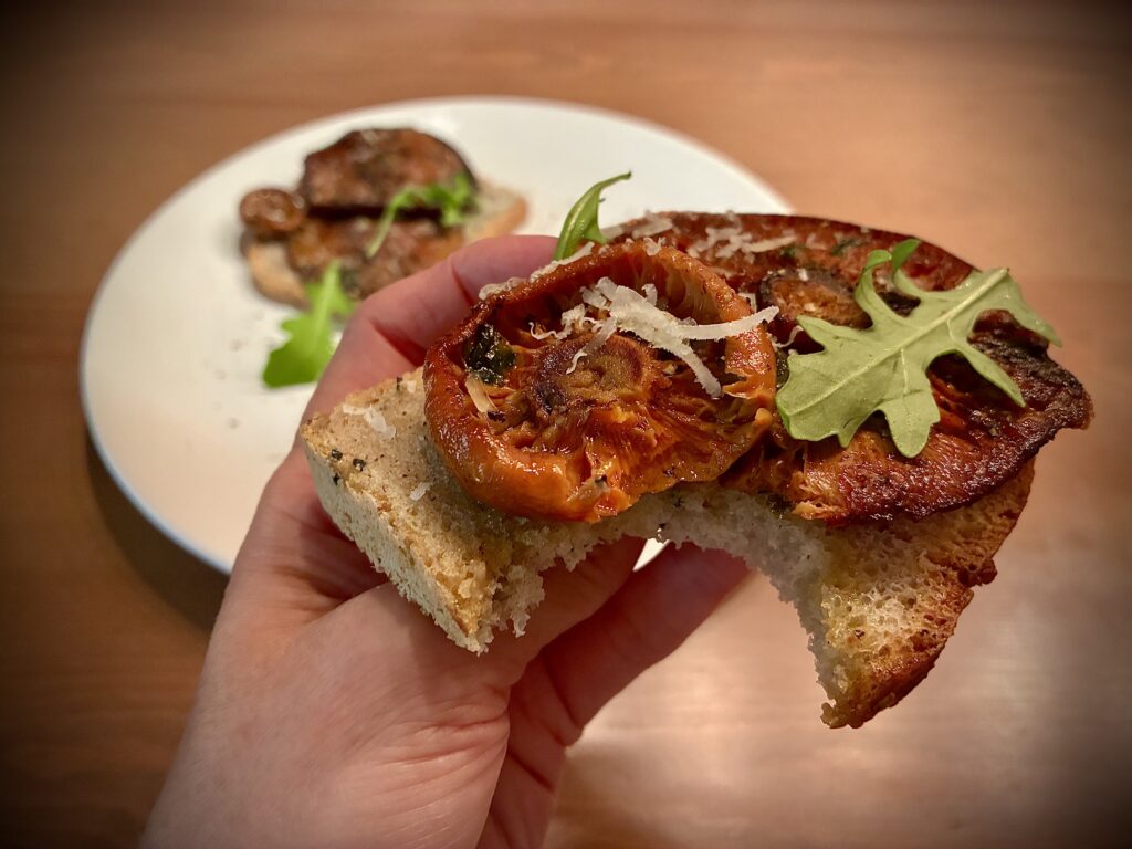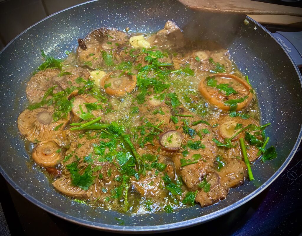 Rydzom ucinamy nóżki (nie będą potrzebne), kapelusze myjemy i osuszamy. Na patelni rozgrzewamy oliwę z masłem wrzucamy grzyby i czosnek, podsmażamy, doprawiamy. Po krótkiej chwili wlewamy wino i dusimy do całkowitej redukcji na dużym ogniu bez przykrycia. Na koniec posypujemy rydze poszatkowaną pietruszką. Opiekamy chleb. Wykładamy kapelusze na pieczywo i lekko posypujemy startym serem, świeżo mielonym pieprzem.