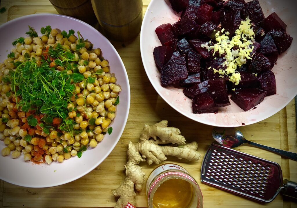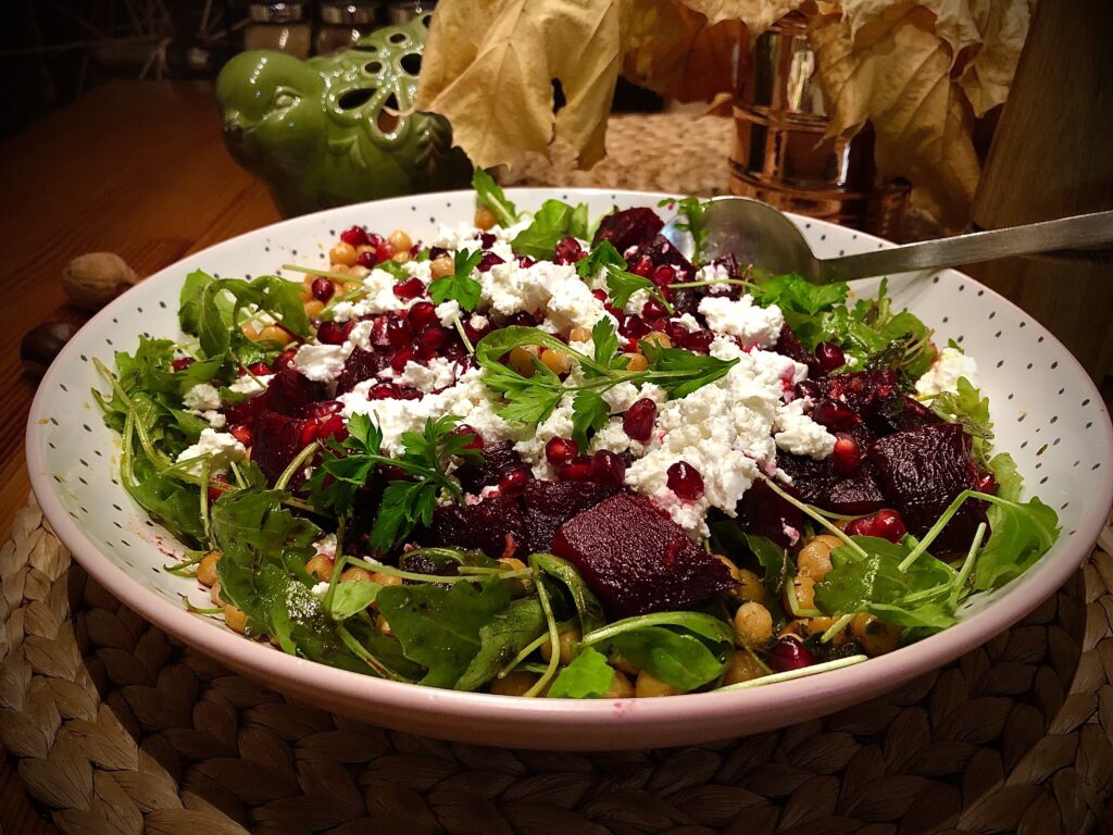 Proporcje składników są dowolne, tak jak lubimy. Jeśli wolimy mieć np. więcej cieciorki niż buraka, czy sałat, komponujemy dowolnie. Gotujemy cieciorkę i odstawiamy do wystygnięcia. Następnie przyprawiamy ją oliwą, tymiankiem, papryką słodką (sporo) i ostrą. Buraka pieczemy lub gotujemy. Można kupić już gotowanego. Ja wsadziłam do kominka, oszczędność czasu i energii. Kroimy na kostkę i doprawiamy oliwą, octem jabłkowym i świeżo startym imbirem. Pozostawiam na chwilę, by smaki się wchłonęły. W dużej misce układamy na dnie naszą cieciorkę, następnie sałaty, kolejno idzie wcześniej przygotowany burak, następnie rozdrobniony twaróg. Całość posypujemy kulkami granatu. Przygotowujemy sos winegret. Czyli łączymy ze sobą oliwę, musztardę, sok z cytryny, miód, sól i pieprz, tak by powstała emulsja. Sosem skrapiamy całość. Nasza sałatka jest gotowa. Smacznego!
