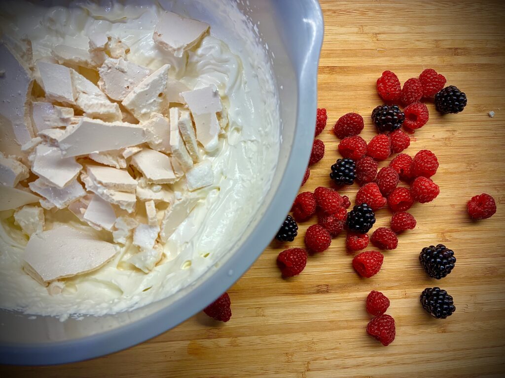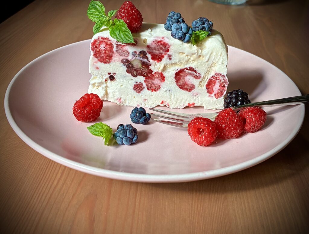 Rozpoczynamy od upieczenia bezy. Do głębokiej miski wlewamy białka, dodajemy szczyptę soli i ubijamy na sztywną pianę, następnie partiami wsypujemy cukier cały czas ubijając. Trzeba uważać, żeby nie „przebić” masy. Musi być cały czas szklista i sztywna. Na koniec wsypujemy mąkę ziemniaczaną i delikatnie miksujemy na wolnych obrotach. Pieczemy w temperaturze 100°C przez 1,5 godziny. Można także kupić gotową bezę, ale trzeba zwrócić uwagę na skład, nie każda beza jest bezglutenowa. Śmietankę ubijamy do sztywności. Łączymy bitą śmietanę, owoce i pokruszoną bezę, delikatnie mieszamy, żeby nie zniszczyć struktury owoców. Wykładamy do formy wyścielonej folią spożywczą i wsadzamy na kilka godzin do zamrażalnika. Najlepiej gdyby deser nie zamroził się na kość, tylko był lekko miękki. Po wyciągnięciu z zamrażalnika dekorujemy owocami i listkami mięty.