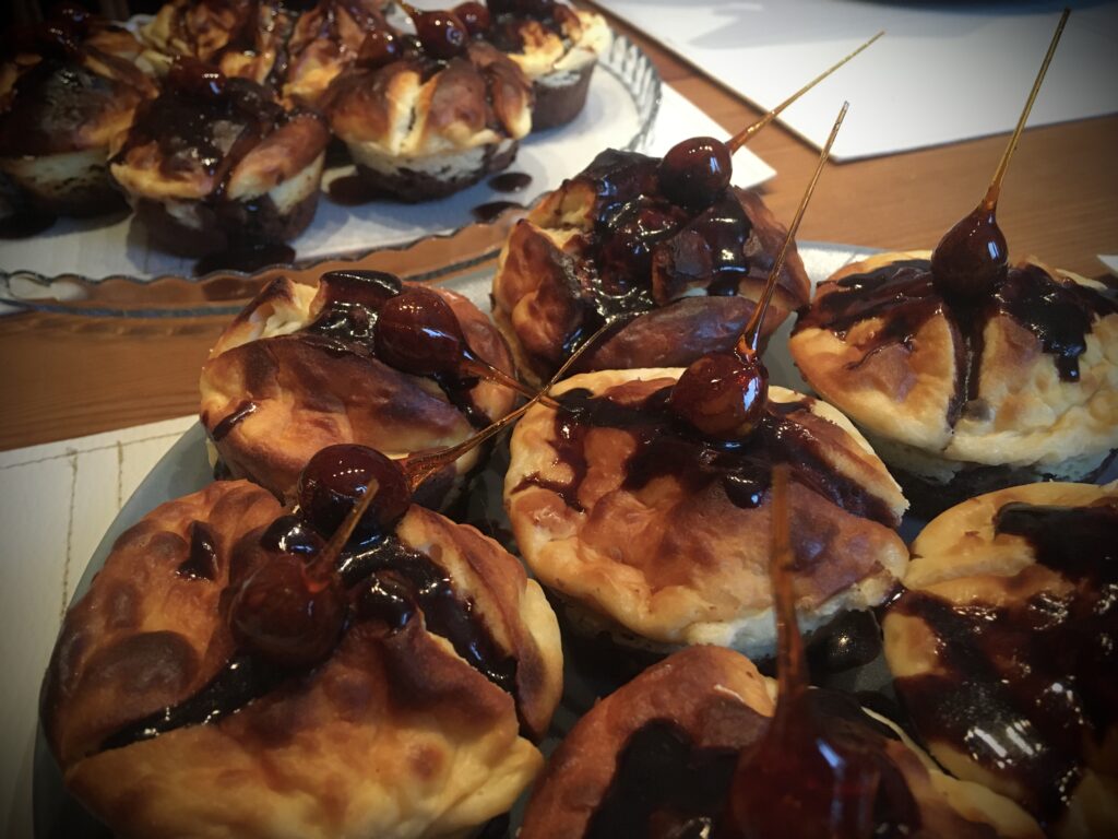 Wszystkie składniki na sernik (ser, połowa szklanki cukru, masło, jajka) włożyć do robota. Na bardzo wysokich obrotach połączyć na gładką, gęstą masę. Wlać do papilotek i piec w temperaturze 180 °C ok 60 minut (może trochę krócej, trzeba sprawdzać patyczkiem). W międzyczasie rozpuścić resztę cukru na zrumieniony karmel i otaczać w nim orzeszki nabite na wykałaczkę, tak by płynny karmel spływał tworząc sopel. Uwaga, żeby się nie poparzyć. Po wystudzeniu serniczków udekorować płynną czekoladą i postawionymi na sztorc kolcami orzechowymi.