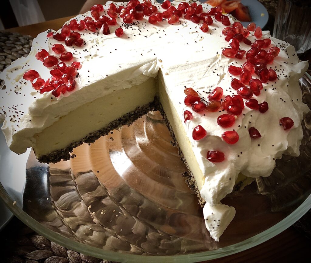 Rozpoczynamy od przygotowania spodu. Łączymy ze sobą wszystkie składniki: kokos, orzechy, mak, 2 jajka i cukier waniliowy. Struktura będzie sypka, ale to nie ma znaczenia. Wykładamy na spód tortownicy, który wcześniej został wyłożony papierem do pieczenia. Równomiernie rozprowadzamy i ubijamy dnem szklanki, tak by powstała zwarta powierzchnia. Podpiekamy w temperaturze 180°C ok 10 minut. Następnie lekko studzimy i wylewamy wcześniej przygotowaną masę serową. Masę serową przygotowujemy w najprostszy sposób, do robota kuchennego wkładamy wszystkie składniki: ser, 4 jajka, masło, budyń i cukier. Na bardzo wysokich obrotach łączymy na gładziuteńką masę. Całość pieczemy w temperaturze 200°C ok 45 minut. Po wystudzeniu dekorujemy bitą śmietaną (ubita kremówka). Posypujemy brzegi owocami granatu i makiem. Będzie wyglądał zjawiskowo.
