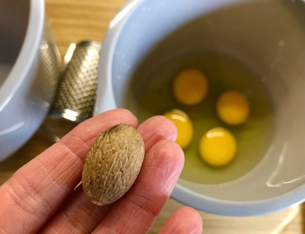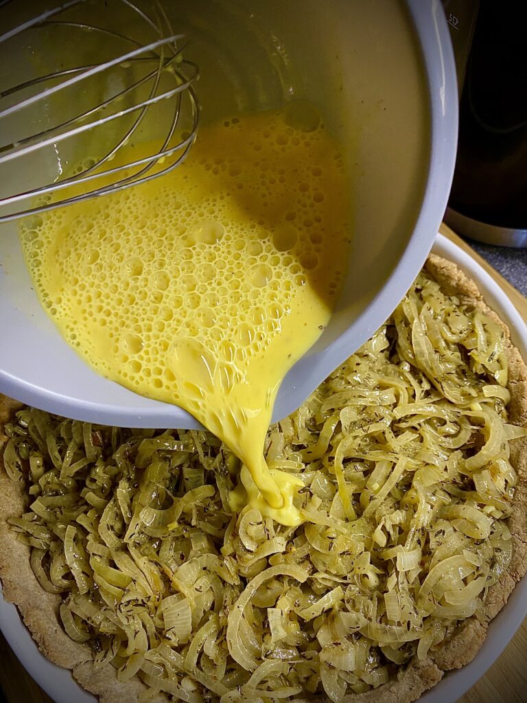 Cebulę kroimy na piórka. Rozgrzewamy pół kostki masła i sporą ilość oliwy i  dusimy cebule z dodatkiem soli, pieprzu i tymianku. Jak zmięknie dodajemy wino i znów dusimy do miękkości i odparowania alkoholu. Wcześniej przygotowujemy ciasto. Łączymy mąkę, dwa jajka i pół kostki masła. Wsadzamy do lodówki do schłodzenia. Następnie równomiernie wykładamy ciasto na formę do tarty. Nakłuwamy widelcem i podpiekamy w temperaturze 200°C do lekkiego zrumienienia. Na podpieczone ciasto wykładamy cebulę i zalewamy roztrzepanymi  z mlekiem jajkami doprawionymi gałką muszkatołową. Całość posypujemy serami i pieczemy do zrumienienia w temperaturze 200°C przez ok 25 minut.