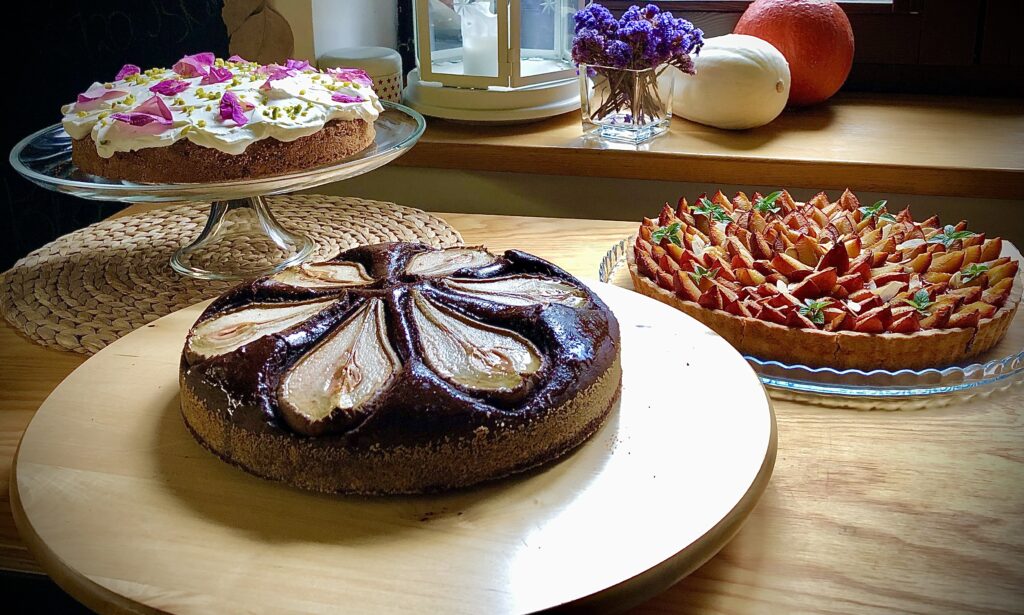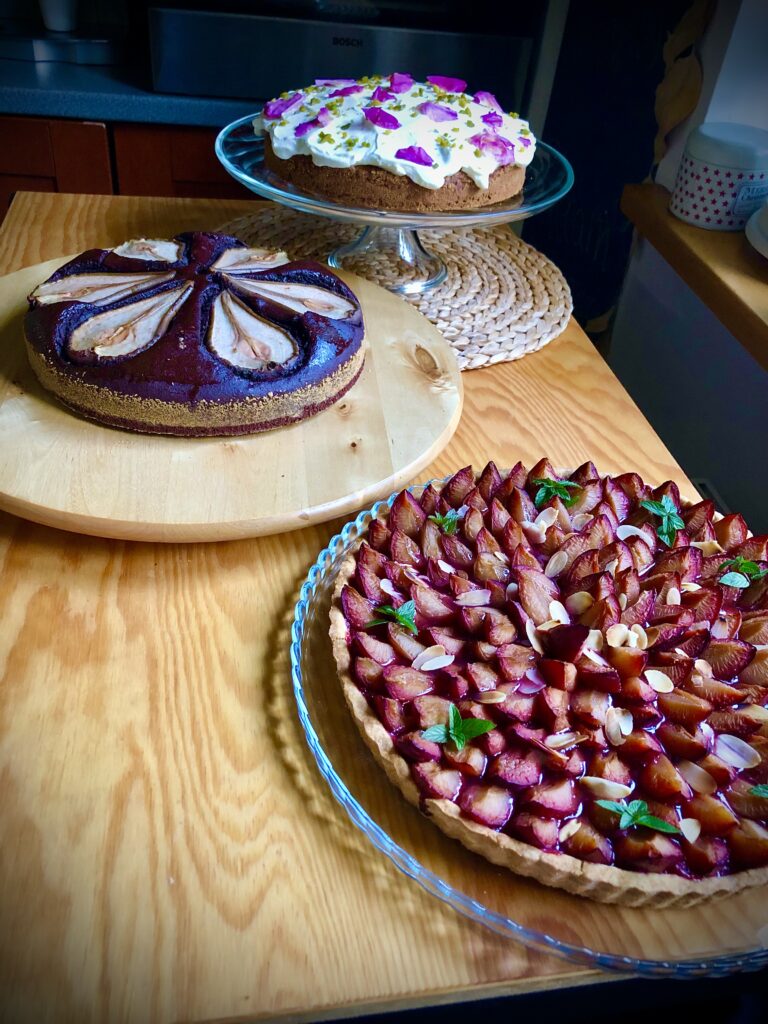 Wszystkie składniki na ciasto wyrabiamy i wykładamy nim formę do tarty. Jeśli robicie kruche ciasto z mąki bezglutenowej, wówczas najlepiej korzystać z formy na tartę, której dno jest ruchome, ponieważ kruche bezglutenowe jest naprawdę kruche i bardzo ciężko utrzymać je w całości, mega się kruszy. Forma z ruchomym dnem pozwala bezszkodowo wyciągnąć ciasto i umieścić na paterę. Być może trzeba będzie do podanej proporcji mąki i masła dodać jeszcze jedno jajko, wyczujecie. Tartę podpiekamy w temperaturze 200 °C, następnie jeszcze gorącą smarujemy dżemem i układamy ćwiartki śliwek na sztorc, gęsta zabudowa :). Pieczemy jeszcze ok 20 minut. Następnie po wystudzeniu dekorujemy uprażonymi wcześniej płatkami migdałowymi i świeżą miętą. Na zdjęciu poniżej tarta w towarzystwie dwóch koleżanek, gruszkowej poezji i różanej marchewki :).