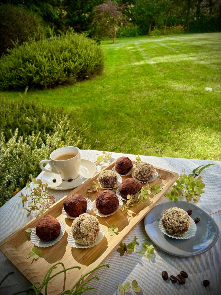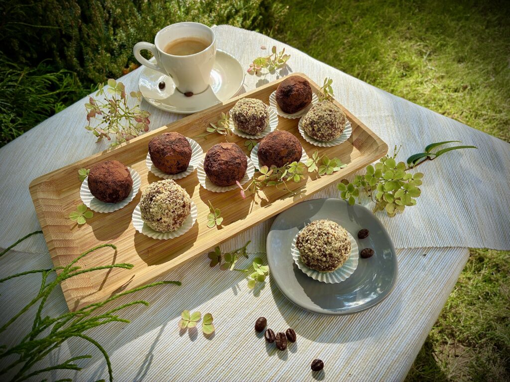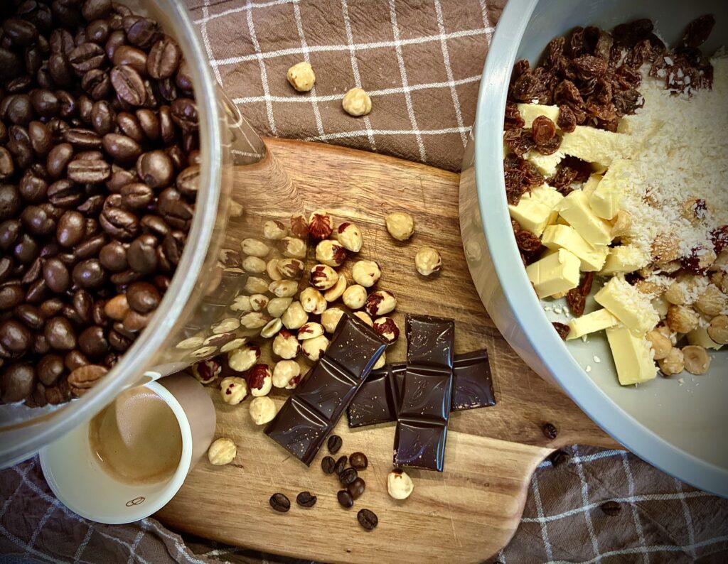 W robocie kuchennym rozdrabniamy kawę (pomijamy ten krok, jeśli używamy kawy już zmielonej), dodajemy połamaną czekoladę i rozdrabniamy. Następnie dodajemy orzechy, które wcześniej najlepiej uprażyć na patelni. Mielimy wszystko. W kolejnym kroku dodajemy rodzynki, które wcześniej były namoczone w gorącej wodzie. Muszą być w miarę odciśnięte. Na koniec dodajemy masło, kokos i wszystko łączymy ze sobą. Odstawiamy na godzinę do lodówki, żeby masa stała się twarda. Formujemy kuleczki dowolnej wielkości i obtaczamy w kakao lub pokruszonych orzechach. Wstawiamy do lodówki, żeby znów stały się twarde.