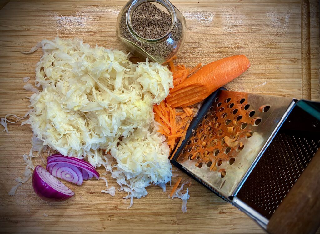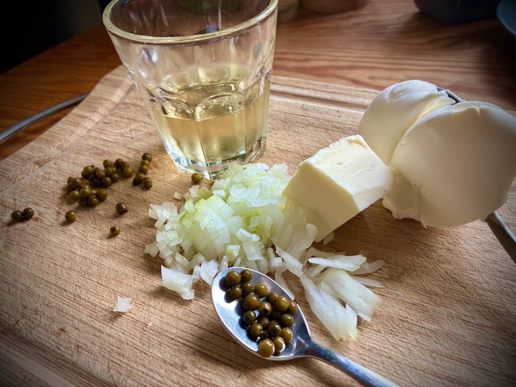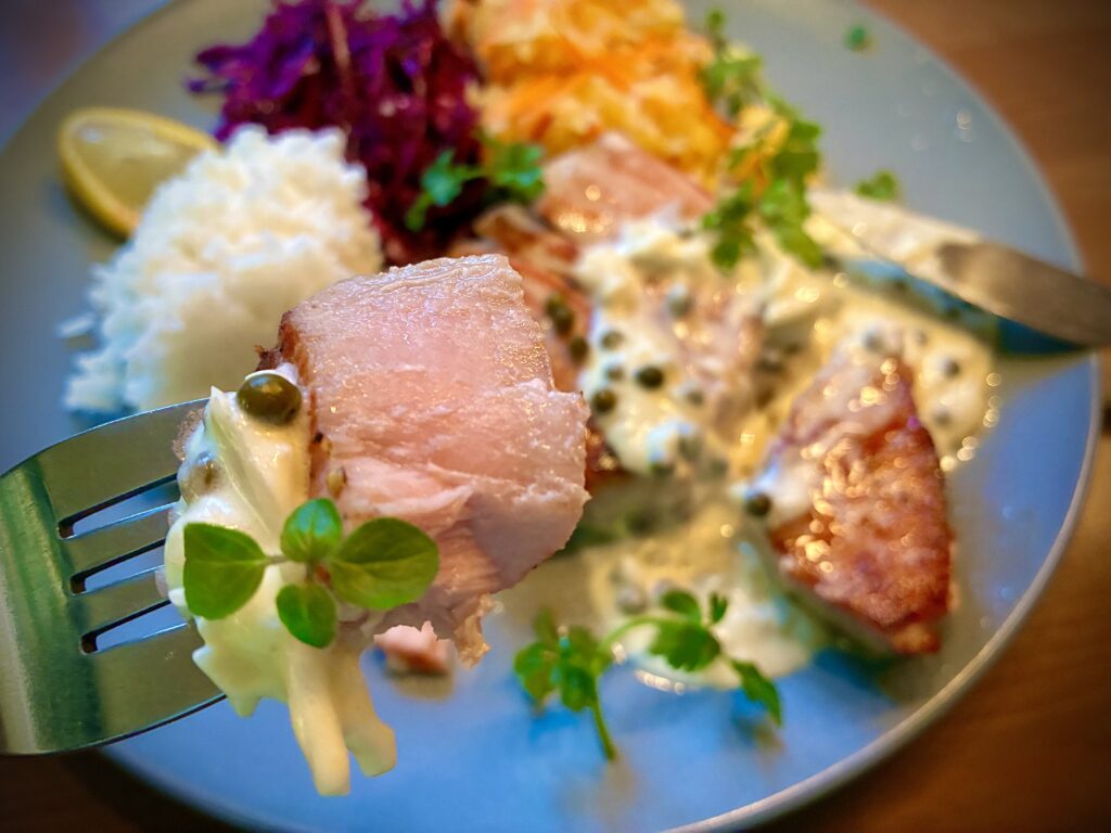 Steki z tuńczyka muszą być o temperaturze pokojowej. Myjemy je i osuszamy ręcznikiem papierowym. Przyprawiamy solą, pieprzem i smarujemy olejem rzepakowym. Surówki przygotowujemy wcześniej. Kiszoną kapustę szatkujemy. Dodajemy startą na grubych oczkach marchewkę oraz drobno pokrojoną czerwoną cebulę. Proporcje takie jak lubimy. Dodatkowo dodajemy pieprz oraz ziarna kminku. Skrapiamy olejem rzepakowym. Drugą surówkę przygotowujemy ze świeżej czerwonej kapusty. Kapustę szatkujemy, dodajemy pokrojoną czerwoną cebulę, proporcje takie, jak nam odpowiadają. Dodatkowo dodajemy drobno pokrojone mango lub pomarańczę. Przyprawiamy octem jabłkowym oraz olejem rzepakowym, solą i pieprzem. Przygotowanie sosu rozpoczynamy od zeszklenia na maśle bardzo drobno pokrojonej białej cebuli. Dodajemy zielony pieprz oraz wlewamy wino. Gotujemy chwilę. Następnie dodajemy serek mascarpone. Tworzy się emulsja. Należy próbować, bo pewnie trzeba będzie dodać soli i pieprzu. Wciskamy kilka łyżek soku z cytryny. Dodajemy odrobinę wody, żeby sos był rzadszy i mógł się jeszcze chwilę redukować, by wydobyły się aromaty z wszystkich składników. Ma mieć konsystencje śmietany. Gotujemy ryż. Steki wkładamy na patelnię na mocno rozgrzany olej i smażymy z każdej strony po 3 minuty. Ma być różowy w środku. Następnie wszystko po kolei wykładamy na talerz i dekorujemy dowolną zieleniną. Serwujemy z kawałkiem cytryny.