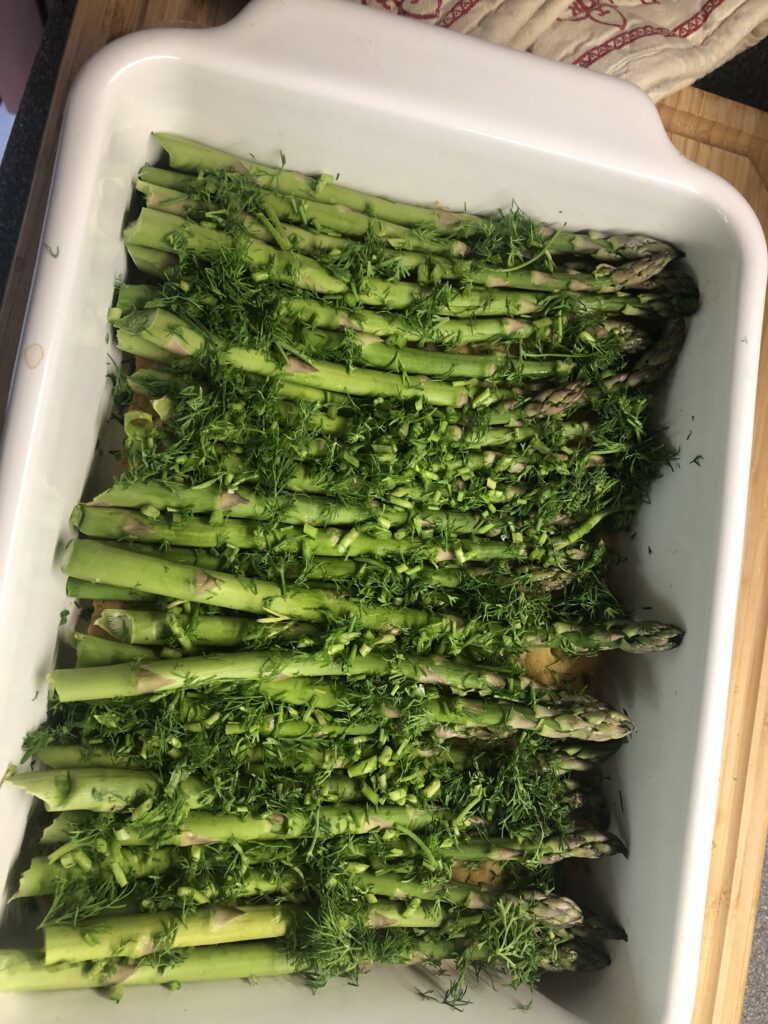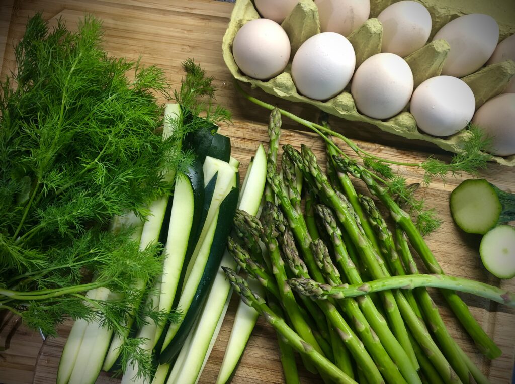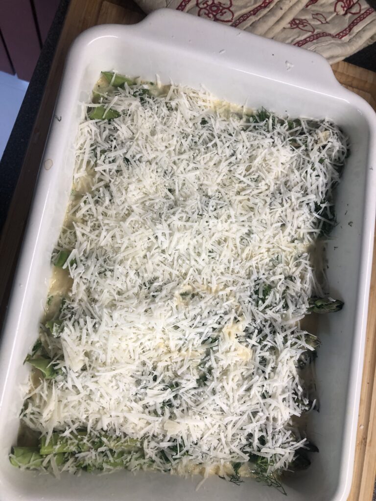 Przygotowujemy ciasto, czyli łączymy mąkę, dwa jajka i pół kostki masła, robimy kulkę. Wsadzamy do lodówki do schłodzenia. Następnie równomiernie wykładamy ciasto na formę do tarty. Nakłuwamy widelcem i podpiekamy w temperaturze 200°C do lekkiego zrumienienia. Na podpieczone ciasto wykładamy wcześniej umyte szparagi. Należy usunąć zdrewniałe końcówki. Obficie posypujemy poszatkowanym koperkiem oraz cienką warstwą utartego sera. Następnie roztrzepujemy 2 jajka ze śmietanką i doprawiamy do smaku solą i pieprzem, opcjonalnie ziołami prowansalskimi. Wylewamy na szparagi. Całość posypujemy serami i pieczemy do zrumienienia w temperaturze 200°C przez ok 20 minut.