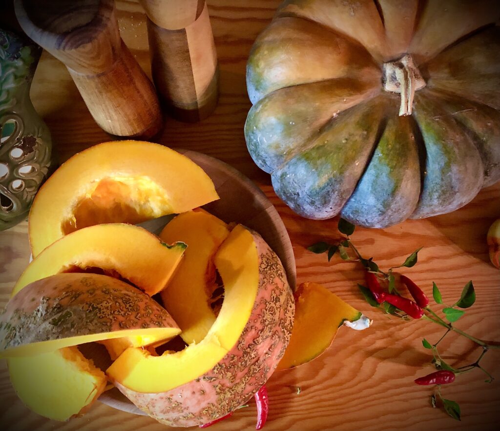 Do garnka wlewamy sporą ilość oliwy, tak żeby zakryła dno, następnie wrzucamy posiekaną cebulę, czosnek i obraną ze skóry, pokrojoną w kostkę dynię. Jeśli macie dynię hokkaido, nie trzeba jej obierać. Chwilę podsmażamy mieszając często, żeby się nie przypaliła. Jest to raczej proces duszenia na oliwie, niż smażenia. Następnie wlewamy wodę, można wzbogacić smak uzupełniając bulionem warzywnym (niekoniecznie). Dodajemy wszystkie przyprawy (do smaku, kwestia indywidualna). Doprawiamy białym winem i zakwaszamy octem jabłkowym i gotujemy kolejnych kilka minut. Jak dynia zmięknie, blendujemy. Na talerzu posypujemy startym serem oraz dowolnymi pestkami. Pycha! 🙂