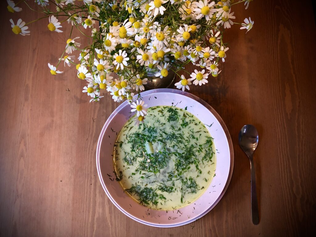 Cebulę i czosnek drobno kroimy i dusimy na maśle. Następnie dodajemy drobno pokrojony koperek i lekko dusimy. Zalewamy wodą i gotujemy do wyciagnięcia aromatu. Na koniec wlewamy zahartowaną śmietanę i zagotowujemy. Podajemy z ugotowanymi ziemniakami, Mocno posypujemy świeżym koprem.